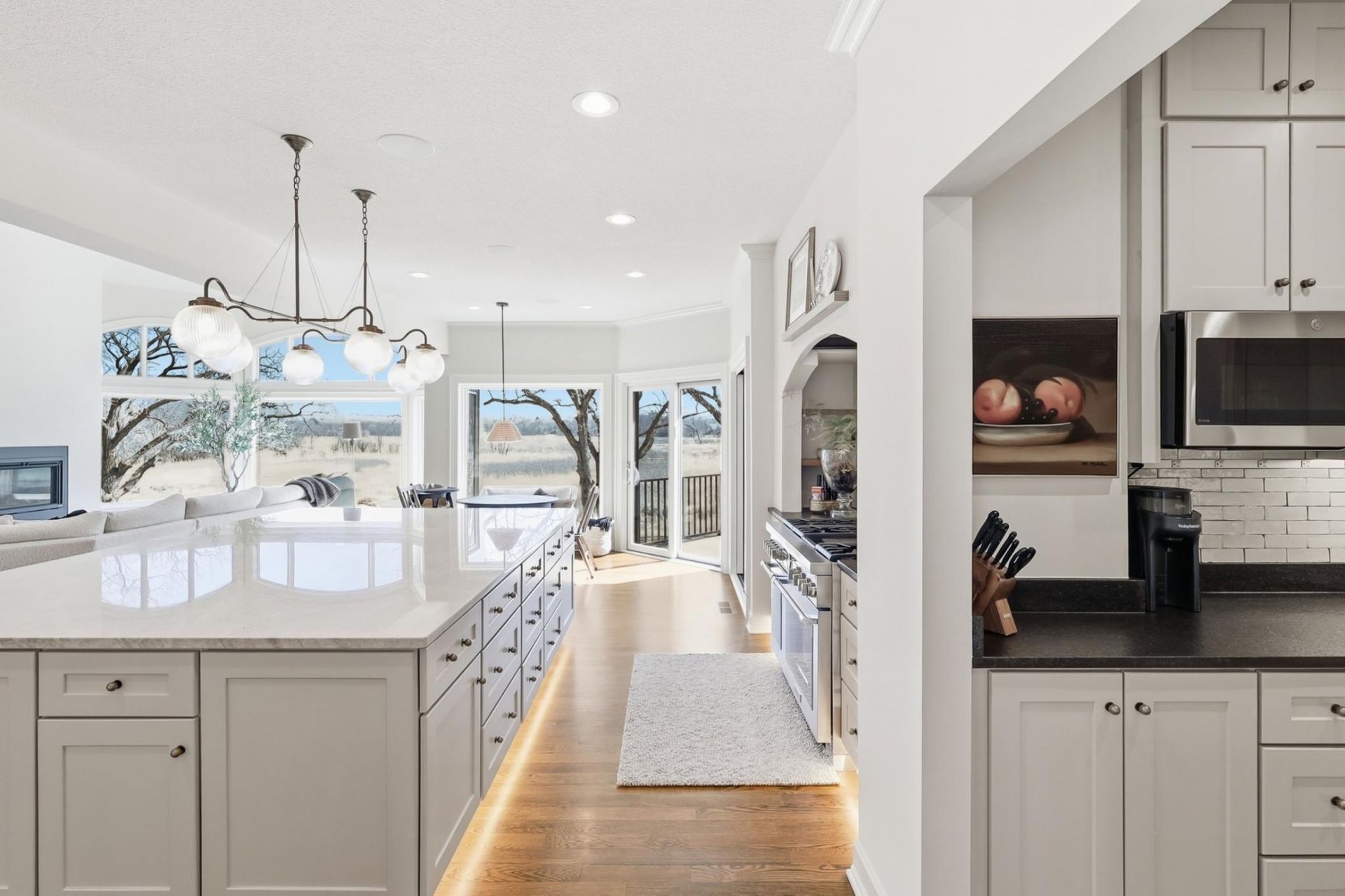 Completely renovated inside and out in 2024, this expansive rambler offers a perfect blend of modern design and effortless living. The open-concept main level features soaring vaulted ceilings, abundant natural light, and serene views of French Lake. At the heart of the home is a gourmet chef's kitchen outfitted with Thermador appliances, custom finishes, and ample space for gathering. The main-floor primary suite is a true retreat, boasting dual closets and a luxurious spa-inspired bath. A formal dining room lined with windows, a private den/office, and a well-designed mudroom with a built-in laundry center complete the main level.The lower level is designed for entertaining, featuring a warm and inviting family room, a spacious game area, an impressive full bar that seamlessly connects with the outdoor pool area. Three additional bedrooms and three bathrooms provide comfort and flexibility for family and guests all with in floor heating. Step outside to your own private oasis. The backyard is thoughtfully designed for both relaxation and entertaining, showcasing stamped concrete patios, a pool house with a fireplace, an under the deck outdoor bar with covered seating area, extensive outdoor lighting, and built-in speakers?creating the ultimate outdoor living experience.