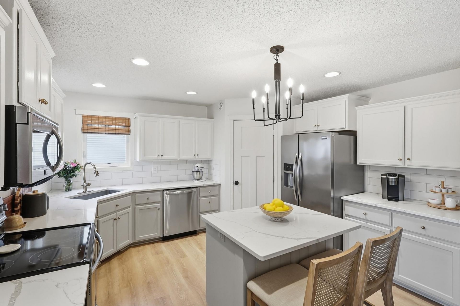 Completely updated and move-in ready home in a highly sought-after south Otsego location. From the moment you walk in, you'll notice the quality of finish making this home stand out. The kitchen has been fully refreshed with quartz countertops, a timeless tile backsplash, beautifully enameled cabinetry, updated hardware, and a new sink and faucet. The center island offers additional prep space and seating. Adjacent is the walk-in pantry with tons of storage. Luxury vinyl plank flooring runs throughout the entire main level and home offers solid, paneled doors. The great room is filled with natural light, vaulted ceilings, custom molding accents surrounding the gas fireplace. Just off the entry, a front flex room with built-ins and a dedicated desk area creates a clean, organized space. Upstairs, the updates continue with enameled trim and doors, along with thoughtfully selected finishes in each of the three upper-level bedrooms. Bathrooms boasting tile flooring, new vanities, stylish lighting, and tile details above the showers. Primary bedroom with private full bath and spacious walk-in closet. The finished lookout lower level, completed in 2026, adds a fourth bedroom, spacious bathroom with dual sink vanity, along with knockdown ceilings and recessed lighting. The layout provides plenty of room for a game table and a large sectional, perfect for a game or movie night. A rough-in for a future wet bar is already in place. Outside, the level backyard is fully set up to enjoy with a newer deck, extended patio, and fenced yard. When the trees fill in, there is tons of privacy! Main floor laundry room and mud room with cubbies, concrete driveway, and a heated 3-car garage complete the home. Minutes to Albertville Outlets and shopping, grocery stores, restaurants, parks, and trails. Definitely a home to see!