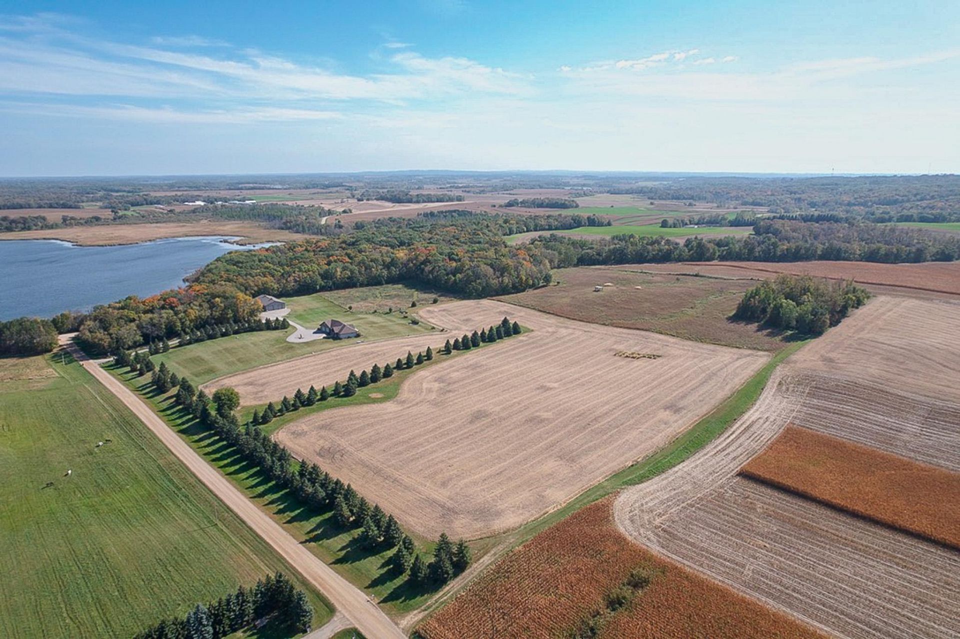 Nestled on 40 acres with breathtaking views this custom-built home presents the country living experience of your dreams. The 54'x96' shed with a Southern exposure covered porch provides you with all your entertaining & storage needs in one space. The impressive ranch style home with amazing views in all directions & is filled with natural light. A heated & finished garage featuring extra storage area, screen porch, built-in dog kennel & wash station and stairs leading to the lower level. Highlights of the main level include a cozy gas fireplace w/ full stone accent, 9' ceilings w/ vaulted great room, chef's kitchen w/ granite tops & walk-in pantry, primary owner's suite with direct access to main floor laundry, Andersen windows plus so much more. In the lower level, you can relax by the wet bar or another fireplace w/ built-in entertainment center. This home was built with efficiency & convenience in mind with geothermal heating, zoned in-floor heating plus a whole property backup generator. There are so many features that this home needs to be experienced to appreciate all the thoughtful upgrades & details. A rare opportunity that combines functionality, elegance & privacy.