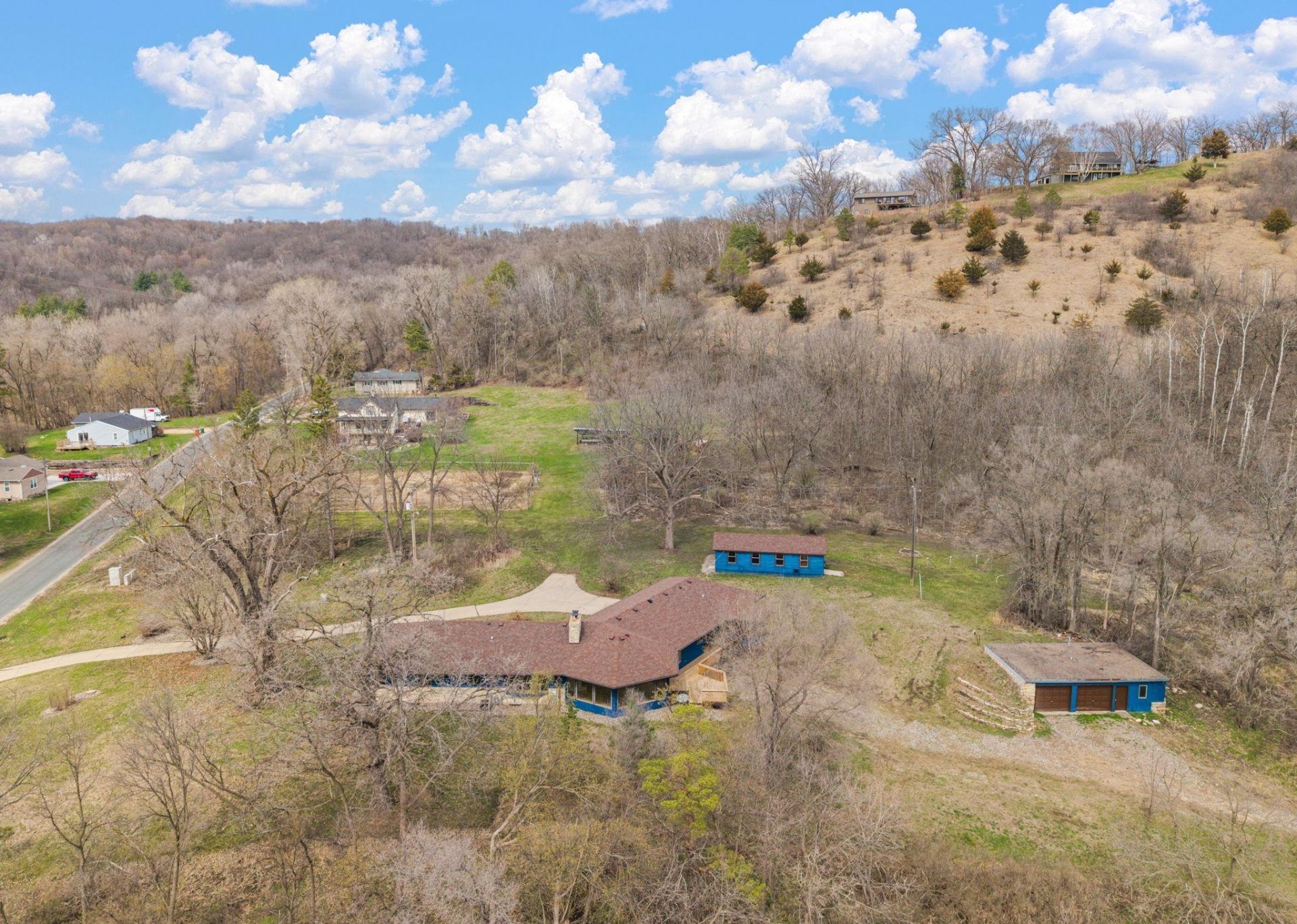 Fully renovated custom-built home offering true one-level living, set on an incredible 42.27 acres across three parcels. This move in ready property combines modern updates with a rare blend of privacy, functionality, and income potential.The home has been extensively updated with a new roof, furnace, boiler, flooring, and fresh paint throughout. The kitchen has been completely remodeled with a new center island, double oven, hood system, and updated finishes, while both bathrooms have been fully renovated. A new washer and dryer add to the convenience.. The basement offers excellent potential to be finished, adding considerable additional square footage and value. Outside, the property truly shines. Enjoy a fully fenced 2,500 sq ft garden with 8-foot fencing, a barn, and a separate two car garage, with its own driveway, the separate garage also has heat and electricity. The land offers exceptional hunting opportunities nestled between scenic bluffs, creating a private and picturesque setting. An existing billboard contract provides additional income potential. A rare opportunity to own a turnkey home with acreage, outbuildings. Come experience your new dream property.Parcel IDs: 43.134.0010, 43.134.0011, 43.135.0090