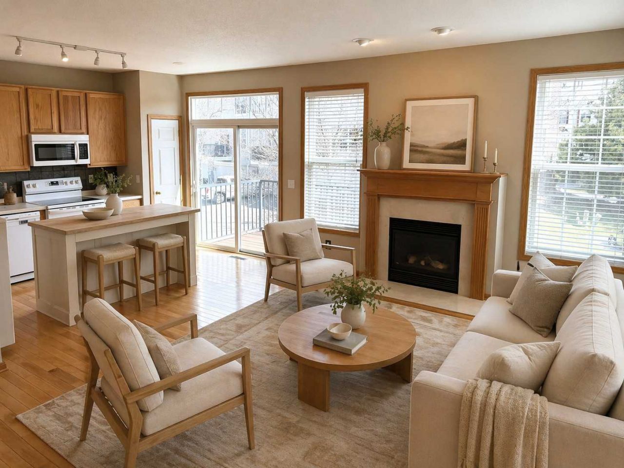 Welcome to this bright and spacious end unit townhome in one of Apple Valley's most sought-after neighborhoods! This move-in ready gem features fresh paint throughout, brand new carpet, and an open concept layout with stunning hardwood floors, tile backsplash, and a cozy gas fireplace in the kitchen. Step out onto your private balcony, perfect for morning coffee or evening relaxation.The upper level offers three bedrooms including a massive owners suite with walk in closet and private bath with soaking tub and separate shower, while the lower level den can easily be converted to a fourth bedroom with its own private bath. The oversized attached two-car garage provides excellent storage and parking. All appliances included, as well as washer, dryer, and water softener.Association amenities include an in-ground pool, kiddie pool, and beautiful green space and park areas. Conveniently located near top schools, shopping, dining, and easy highway access.This beautifully maintained townhome is move in ready and has it all.