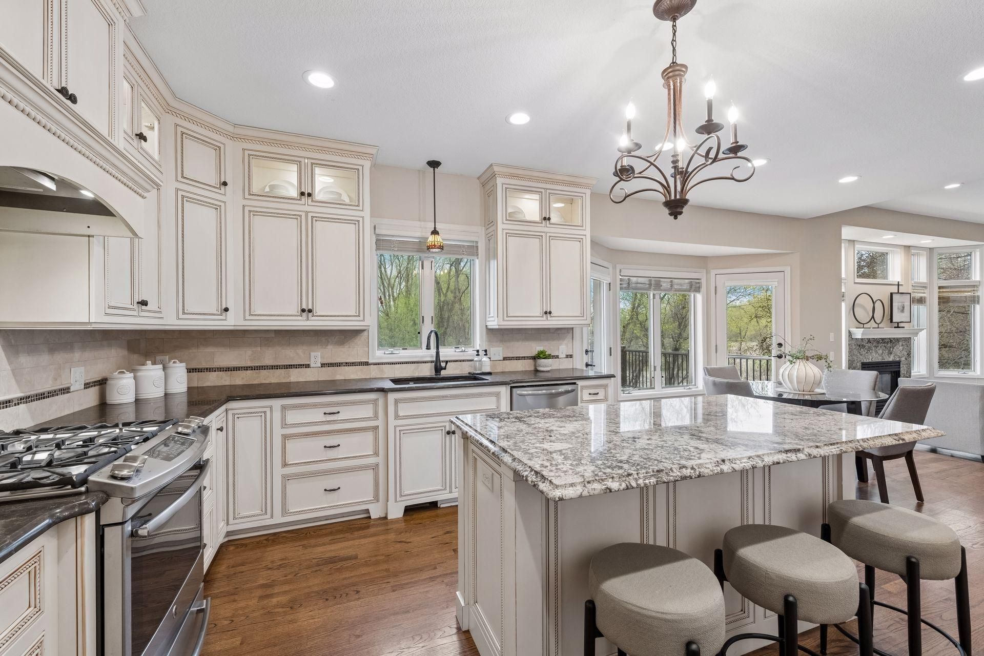 Welcome to this beautifully crafted brick exterior two-story home, perfectly situated on a premier lot with a flat, fenced backyard and stunning year-round views of Elm Creek Reserve. Enjoy direct access to neighborhood trails that connect to miles of Three Rivers Park District and Maple Grove trail systems, ideal for outdoor enthusiasts. Inside, you're greeted by a soaring 2-story foyer with abundant natural light and inviting atmosphere. The beautifully updated kitchen is a true showstopper, featuring floor-to-ceiling cabinetry, stainless steel appliances including a gas range, a large center island, and a spacious dinette with easy access to the deck ~ perfect for outdoor cooking and entertaining. The main floor offers a versatile bedroom with an adjacent full bathroom, ideal as a guest room, home office, or playroom. Upstairs, you'll find three generously sized bedrooms, including a luxurious primary suite with a spa-like bathroom featuring a separate shower, soaking tub, and private water closet. The sprawling finished walkout lower level adds even more living space with a fifth bedroom, flex room, recreation area with wet bar rough-in, and excellent storage. Completing the home is a large three-car garage, along with a concrete driveway and walkway.
