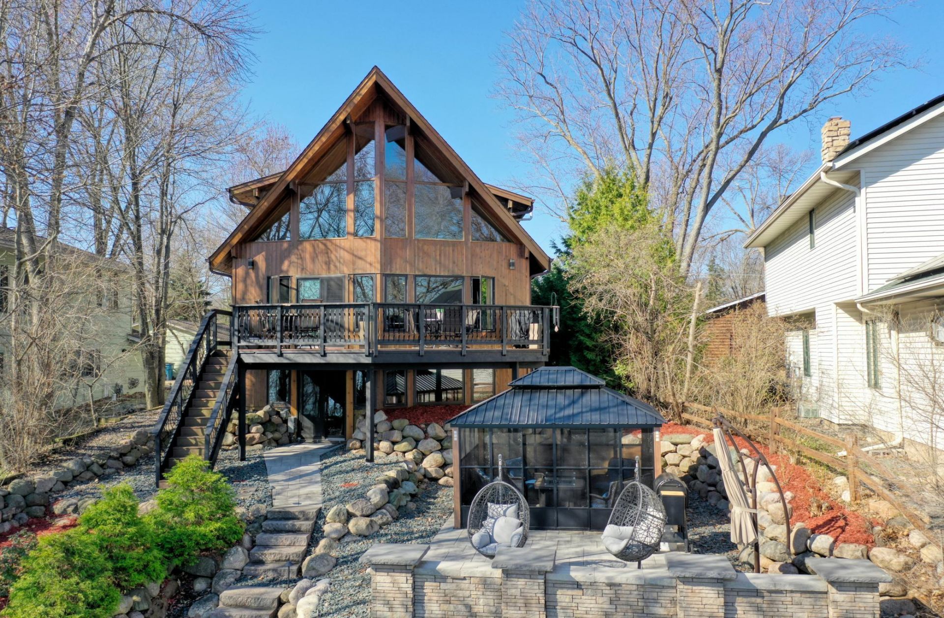 Perfectly perched and nestled upon the serene, exclusive shores of Forest Lake's 3rd lake, this fully renovated five-bedroom, four-bath residence offers a premier, tranquil waterfront lifestyle with refined, modern rustic elegance. COMMANDING elevated views captivate you as you gaze out at the beauty that the lake provides. The A-Frame style just under 4,700 sq ft home maximizes stunning, direct lake vistas through soaring ceilings and expansive windows, merging bright, sophisticated interiors. The open-concept design is flooded with natural light, showcasing breathtaking, panoramic water views directly from the gourmet kitchen and spacious main living areas. The primary en-suite on the upper level is grand, spacious, and features a stunning bath, large walk-in closets, and a private mezzanine overlooking the lower level and offering spectacular views. The walk-out lower level showcases the lake lifestyle with a stylish wet bar, a spacious family room that includes a billiards area, and three additional generously sized bedrooms. Outside, you can relax in your choice of several inviting spots: on the large attached lakeside deck, the outdoor patio, or on the rare boathouse top deck at the water's edge. This waterfront retreat is unlike any other; come and experience the lakeshore dream on one of the metro area's most sought-after lakes.